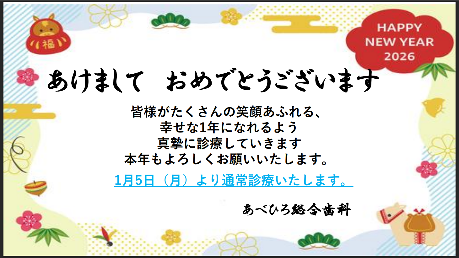 あべひろ総合歯科 NEWS 🌸あけまして、おめでとうございます🌸 🌸あけまして、おめでとうございます🌸 24時間WEB予約 WEB上で問診票を記載24時間いつでも簡単にご予約いただけます! 新患急患随時受付まずは電話予約 048-950-2525 受付 9:30~19:30 休診日 祝日のみ(土日は19:00まで)