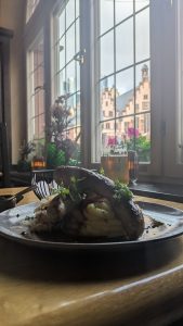レーマー広場で食べるドイツ名物のソーセージとビールは、