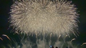 音楽が最高潮に達するのと同時に、夜空一面が黄金色に染まる大迫力の花火。